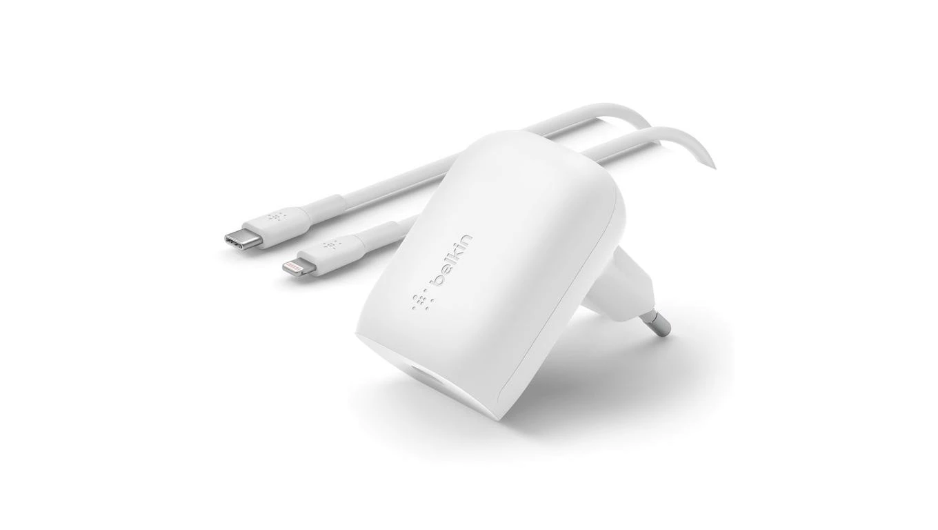 Belkin Ładowarka kątowa 30W USB-C, PD, PPS, biała + kabel Lightning
