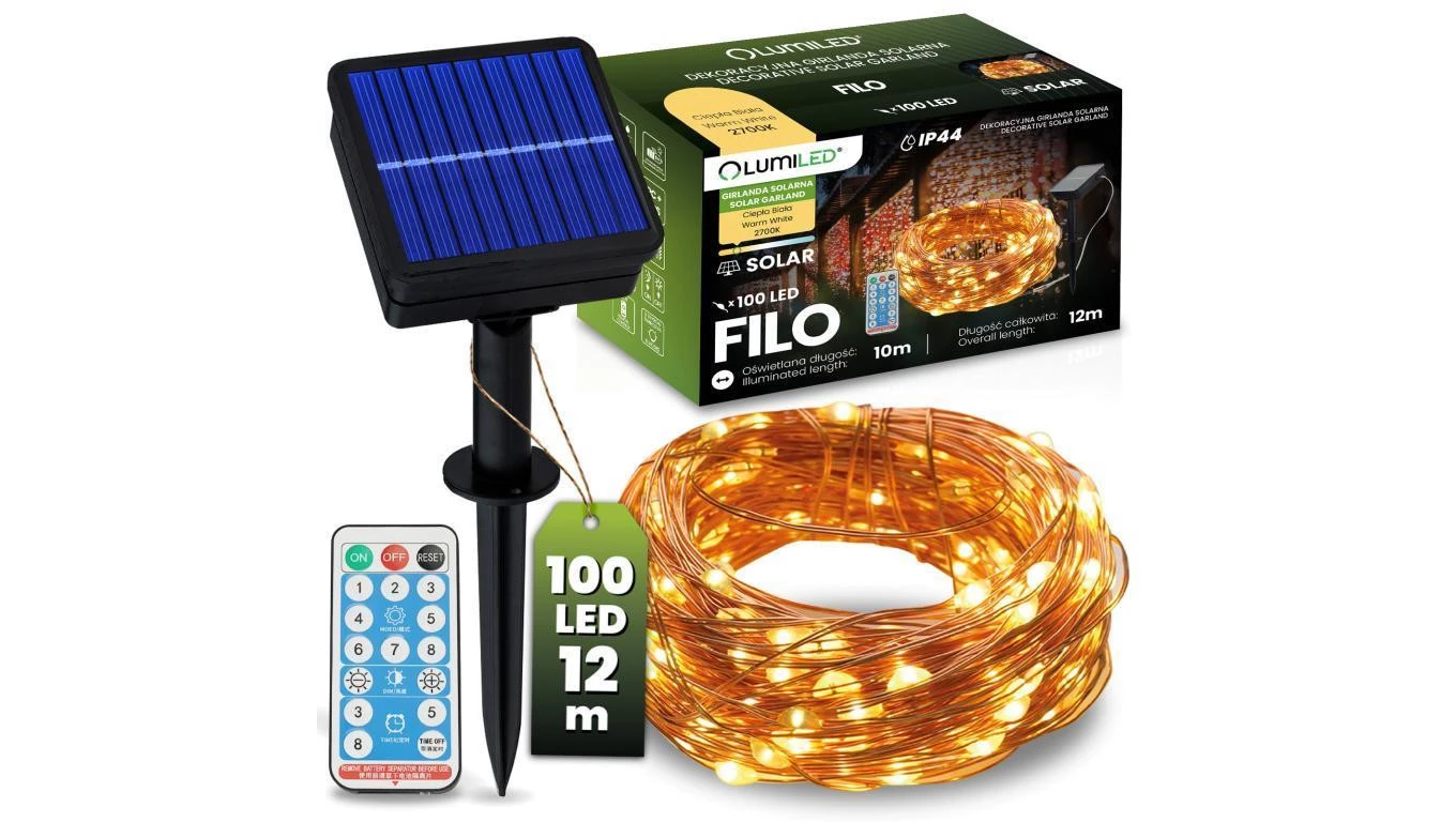 Girlanda Solarna Ogrodowa 100x LED Ozdobne Druciki 12m 2700K Ciepła + PILOT FILO LUMILED