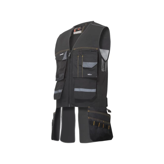 - Kieszenie monterskie wykonane z mocnego materiału typu poliester Oxford 600D z możliwością przypięcia wewnątrz kamizelki Przednie kieszenie monterskie z dodatkowym wzmocnieniem z materiału typu poliester Dobby Oxford oraz szlufkami na akcesoria