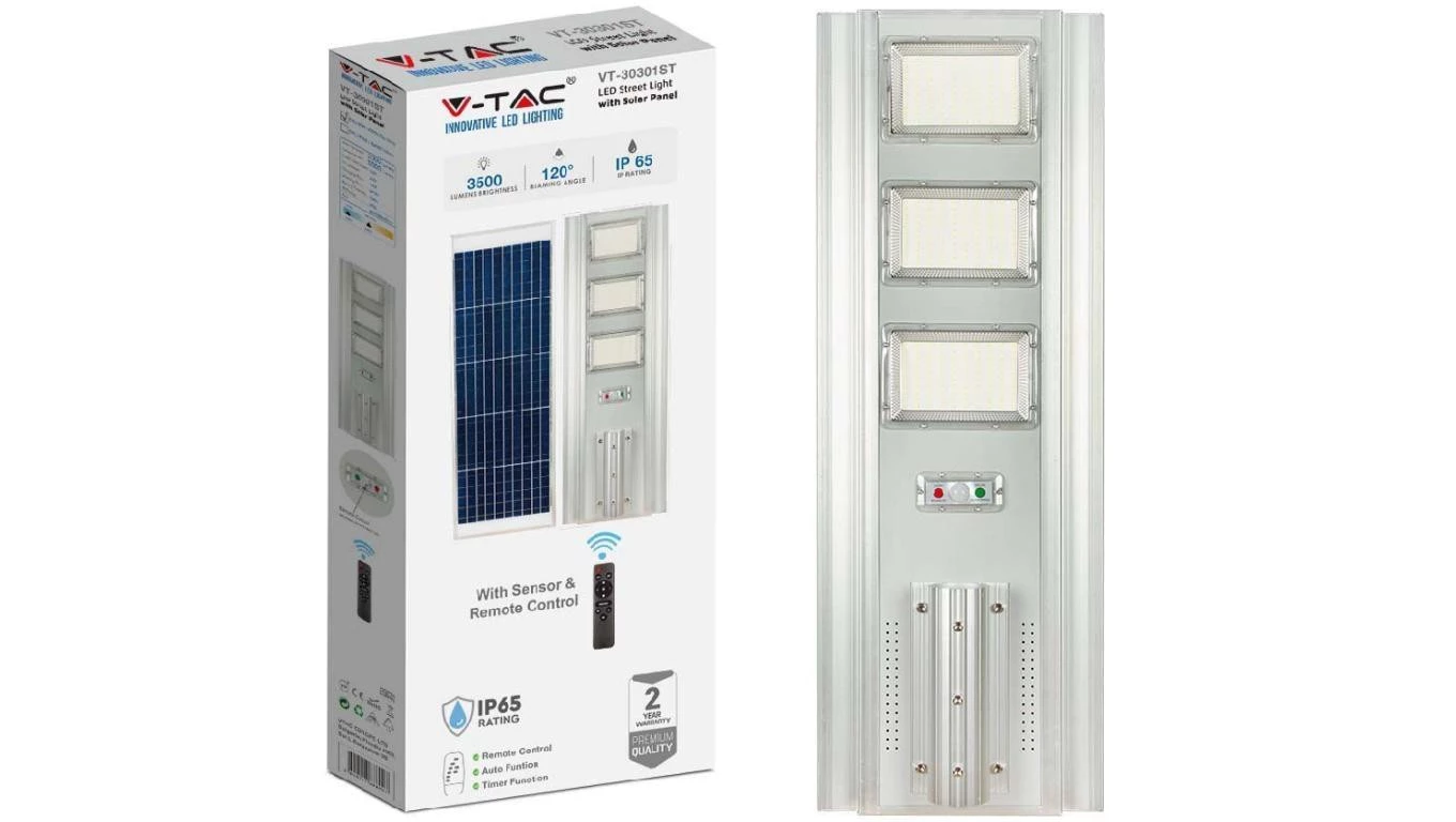 Lampa solarna LED 40W 3500lm 6500K panel fotowoltaiczny, pilot sterowania, czujnik ruchu barwa CW biała zimna V-TAC VT-30301ST
