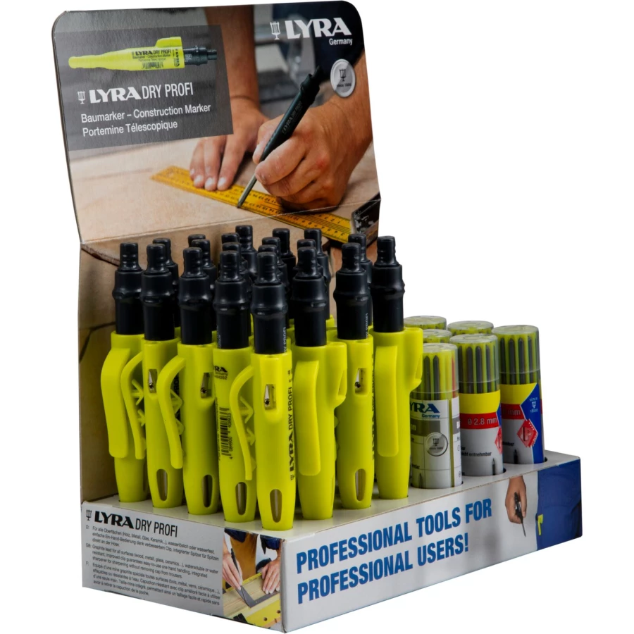 - W skład zestawu wchodzą markery budowlane 20 sztuk LY494202 z wkładami grafitowymi oraz 8 kompletów wkładów wymiennych grafitowych LY499102 oraz 4 komplety wkładów wymiennych LY499401 w kolorach grafitowym 6 sztuk, żółtym 3 sztuki i czerwonym 3 sztuki