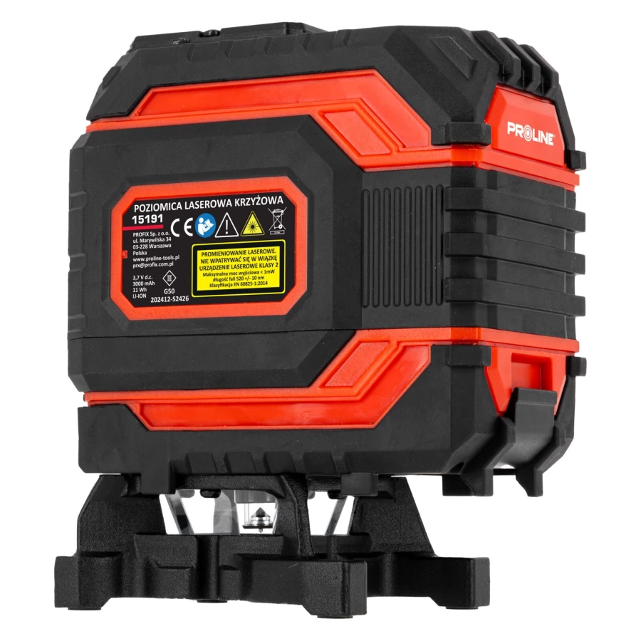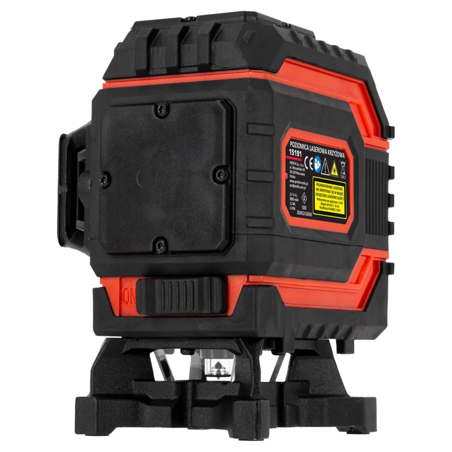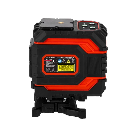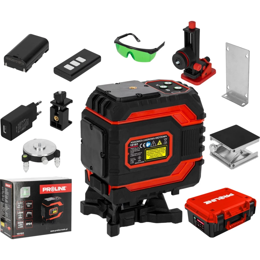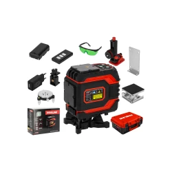 - W komplecie okulary zwiększające widoczność promienia lasera, ładowarka do akumulatorów, uchwyt z magnesem, podstawka obrotowa, pilot , podstawka umożliwiająca podnoszenie lasera w pionie, dodatkowo w modelu 4D uchwyt umożliwiający zawieszenie lasera od góry