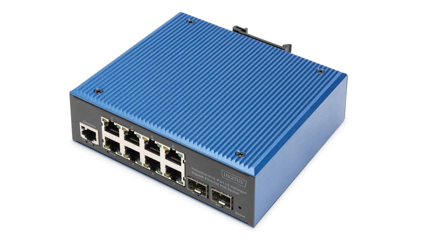 Przemysłowy switch PoE 8xRJ45 GbE + 2xSFP, L2, 30W/port DN-651157