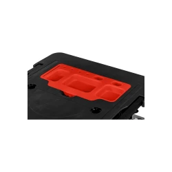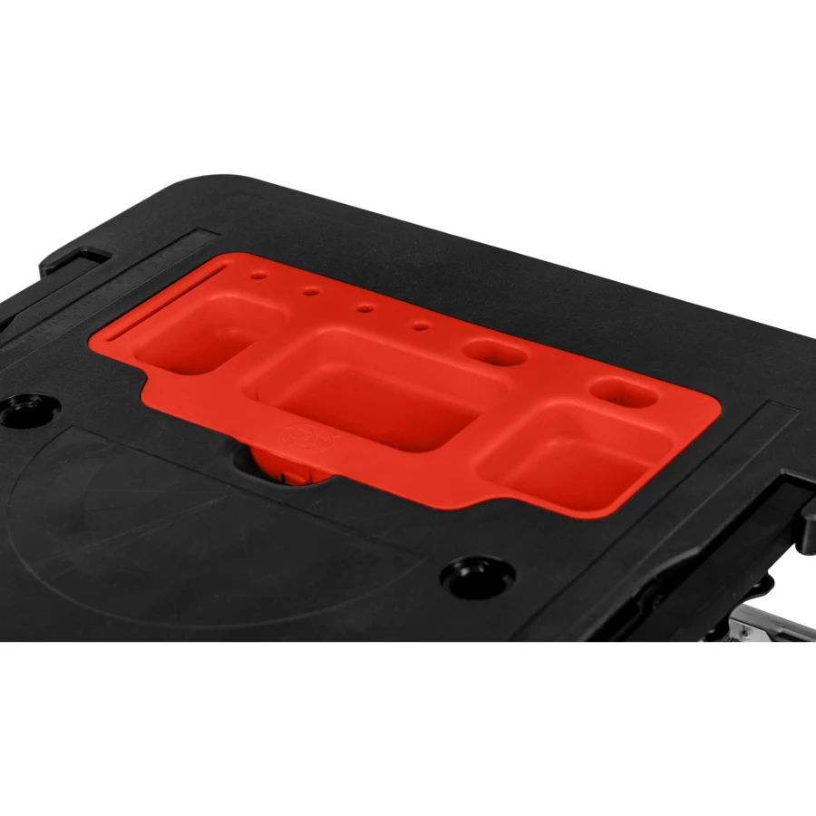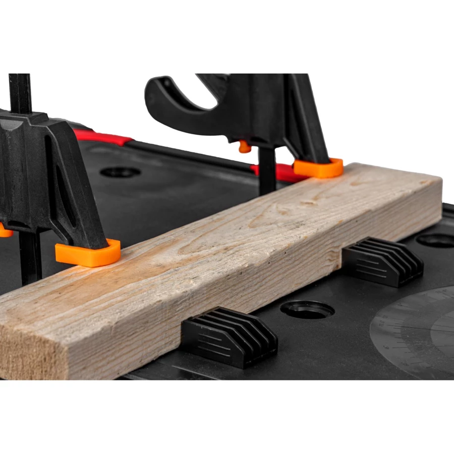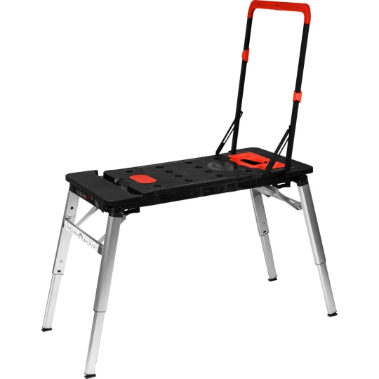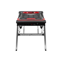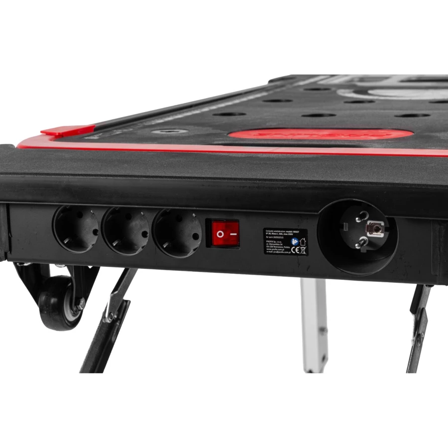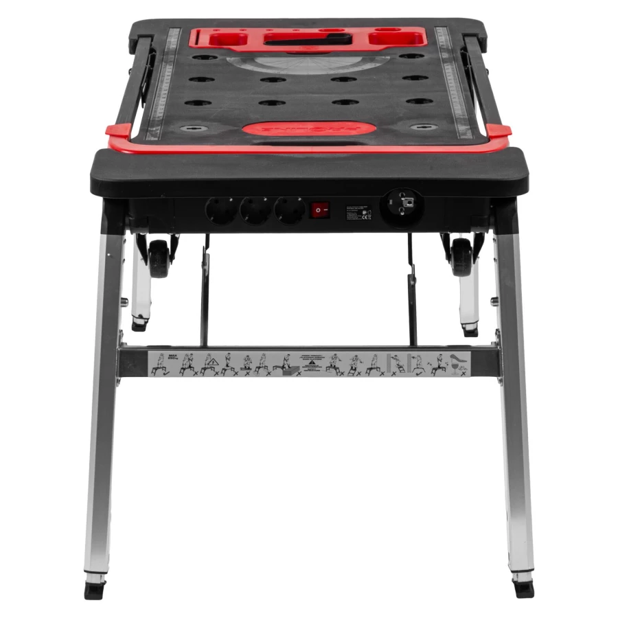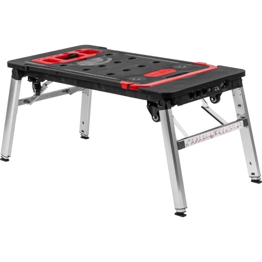 - Stół wyposażony w: 3 gniazda elektryczne, samopoziomujące nakładki na nogi stołu, wyjmowaną tackę narzędziową oraz hak, uchwyt 2w1, uchwyt do holowania, otwory do montażu ścisków , kątownik i liniał oraz blokady obrabianego materiału