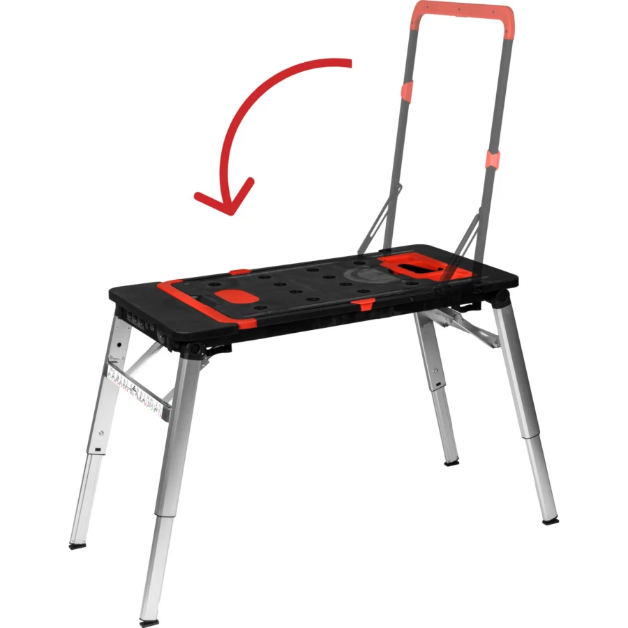 - Składana konstrukcja umożliwia przekształcenie stołu bez użycia narzędzi w różne funkcjonalne konfiguracje, zastępując kilka odrębnych narzędzi i stanowisk roboczych: stół roboczy, kobyłka stolarska, leżanka warsztatowa, wózek transportowy, platforma transportowa, rusztowanie oraz podest