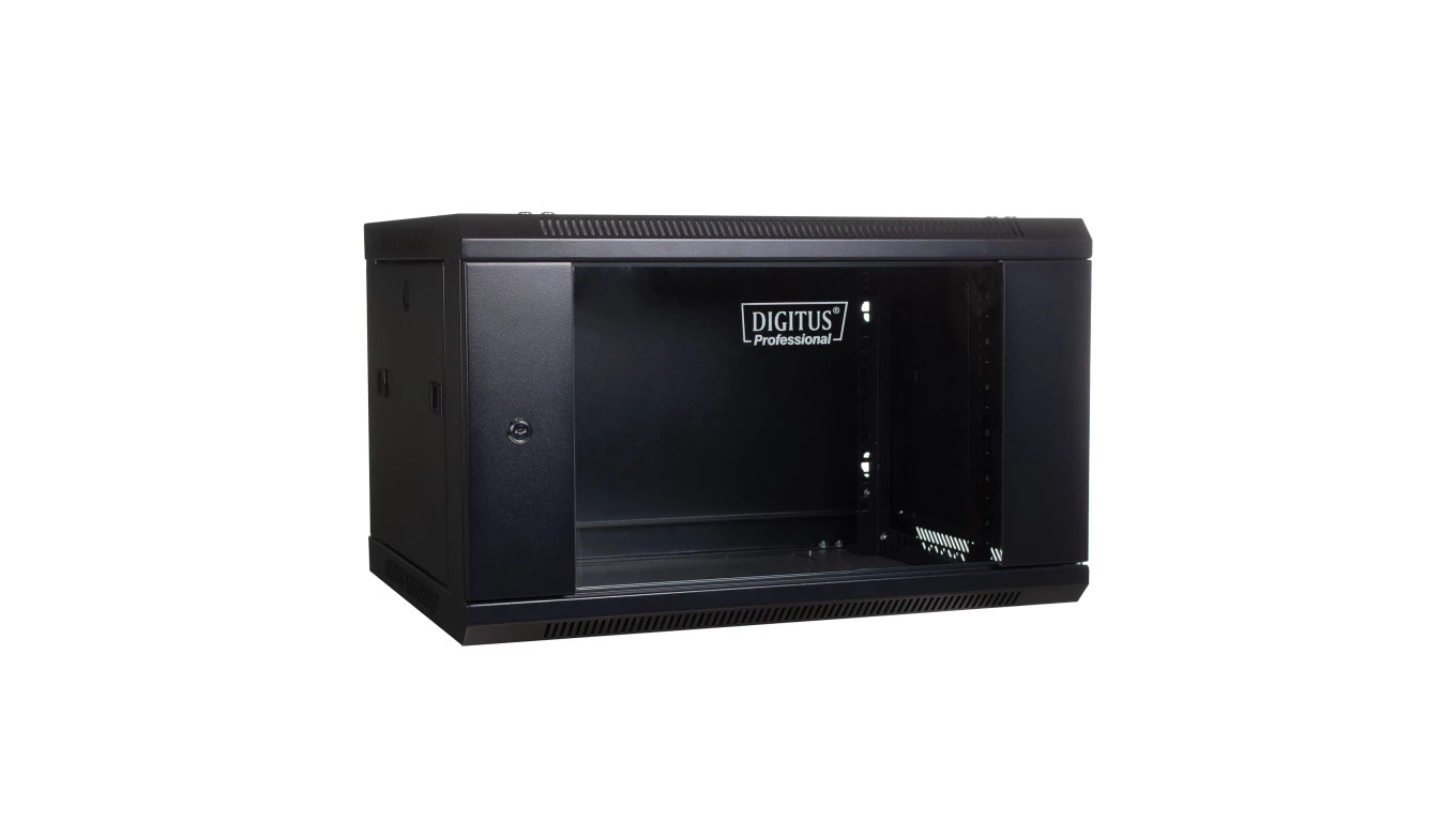 Szafa wisząca jednosekcyjna 19 cali 6U 368/600/450mm drzwi szklane czarna (RAL 9004) niezmontowana DN-WU19 06U/450/B