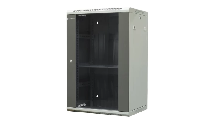 Szafa wisząca niedzielona 19 18U, drzwi blacha/szkło, ściągane osłony boczne z zamkiem, 600×450×910 szer./gł./wys. mm RAL: sza