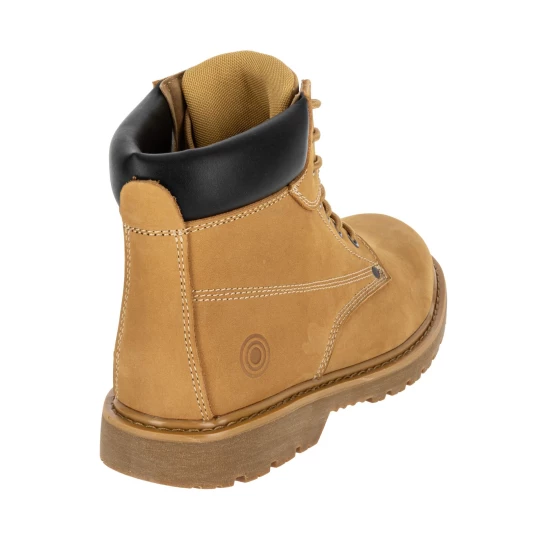 - MATERIAŁ: Wierzch: wysokiej jakości licowa skóra nubukowa. Podszewka: dzianina siatkowa. Wyściółka: wymienna, 1,5 cm grubości w części pięty, miękka i elastyczna. Podeszwa: gumowa o właściwościach antypoślizgowych (podłoże z płytek ceramicznych pokryte gliceryną), odporna na olej napędowy, głęboki bieżnik zwiększa przyczepność do podłoża