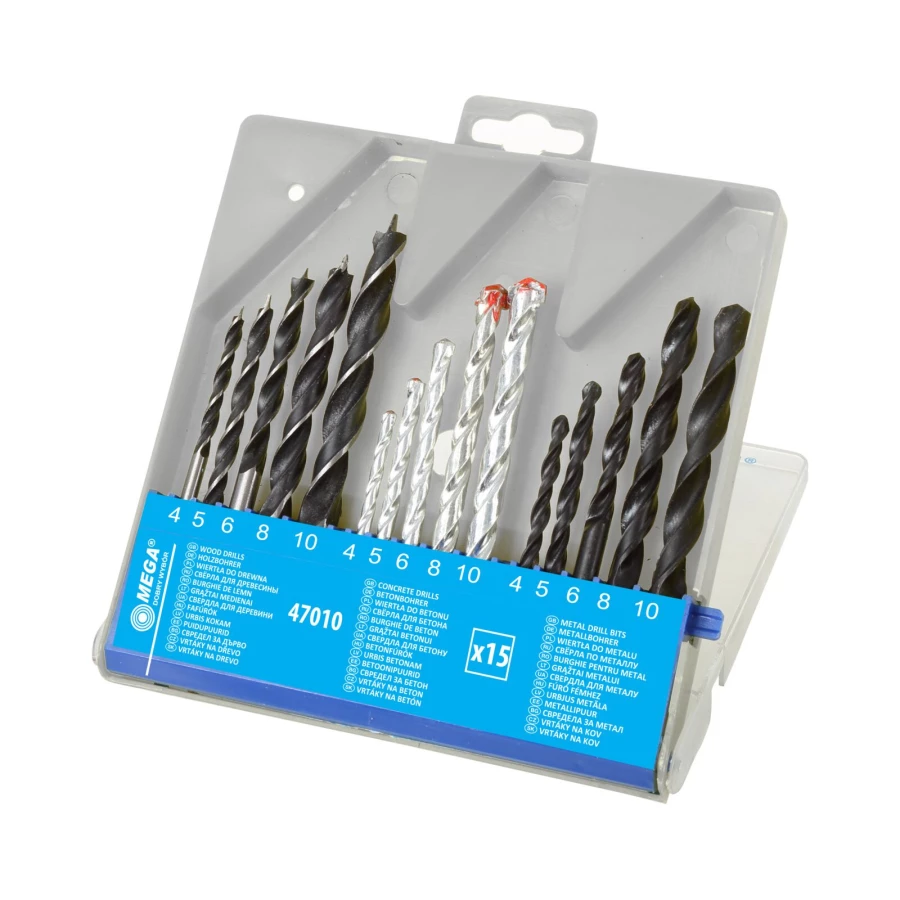 - W zestawie wiertła do metalu, betonu i drewna: 4, 5, 6, 8, 10 mm (po 5 szt.)