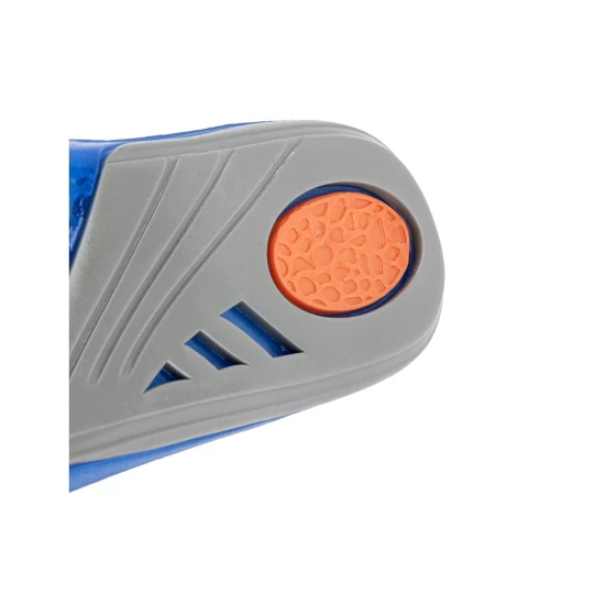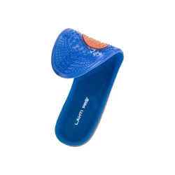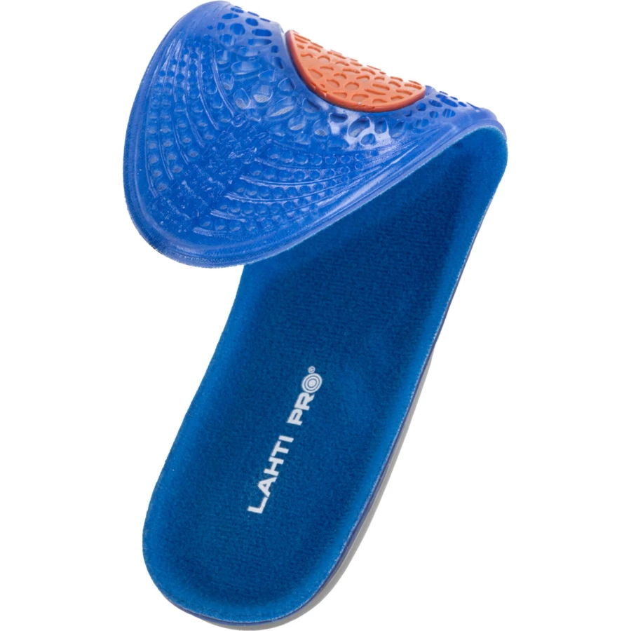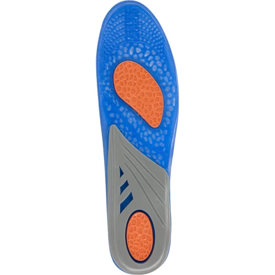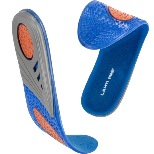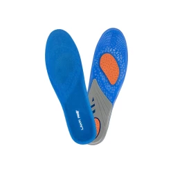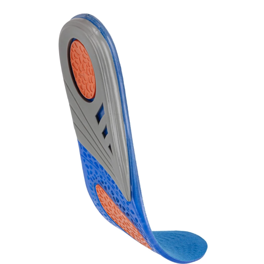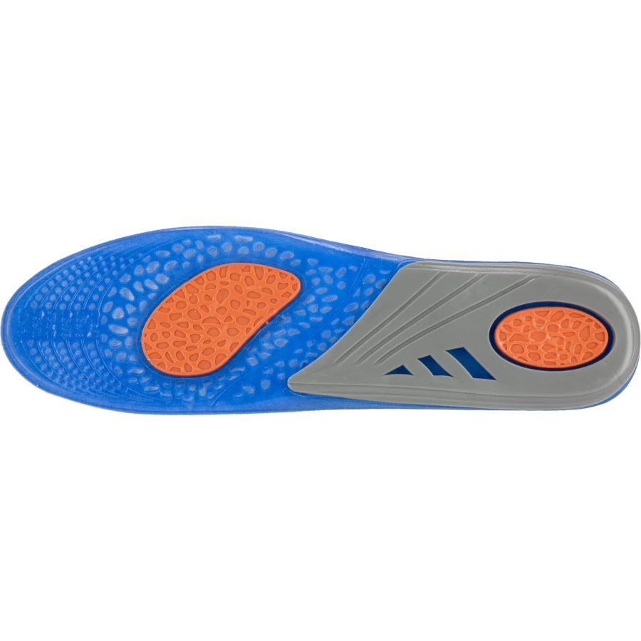- Wykonane z żelu o różnym stopniu gęstości, który strefowo odciąża stopy (miękki i elastyczny niebieski żel- łagodzi nacisk stopy na podłoże, pomarańczowy- pełni funkcję amortyzatora mikrowstrząsów, na jakie narażona jest stopa podczas kontaktu z podłożem oraz szary- stabilizuje piętę utrzymując ją w odpowiedniej pozycji oraz podtrzymuje łuk wzdłużny stopy odciążając ją)