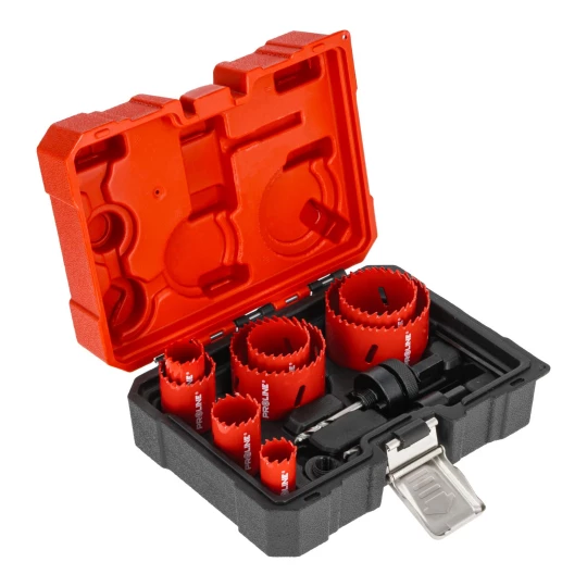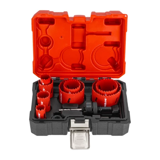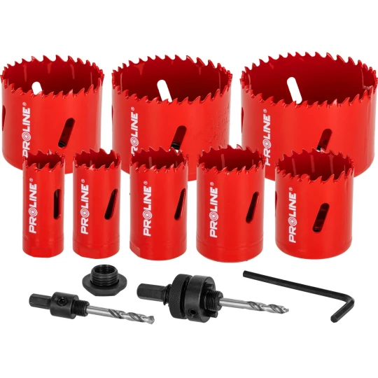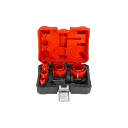 - W skład zestawu wchodzą otwornice o średnicach:22mm, 25mm,30mm,35mm,40mm,51mm, 60mm,68mm oraz 2 adaptery , wiertło pilotujące, klucz hex, przejściowka do adaptera