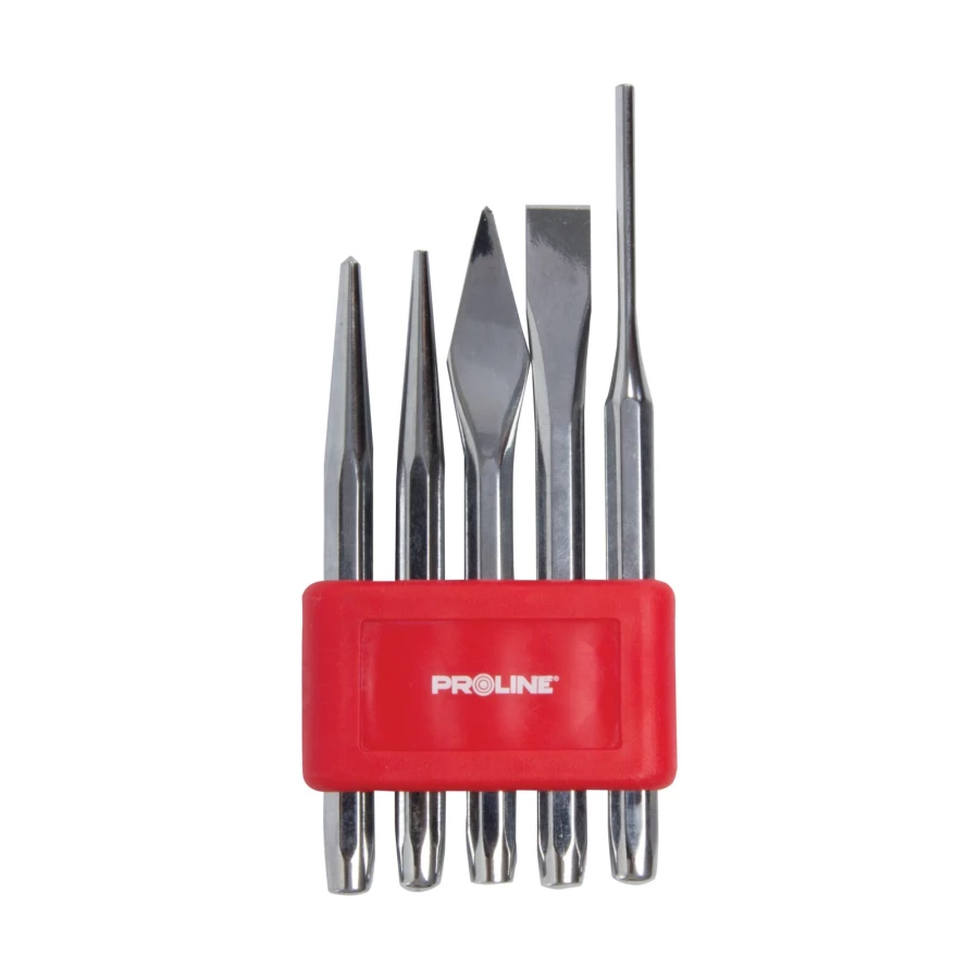 - Zawartość zestawu: - Punktak 120 mm x 4 mm - Dobijak 120 mm x 3 mm - Przecinak krzyżowy 130 mm x 5 mm - Przecinak płaski 130 mm x 12 mm - Wybijak 150 mm x 4 mm