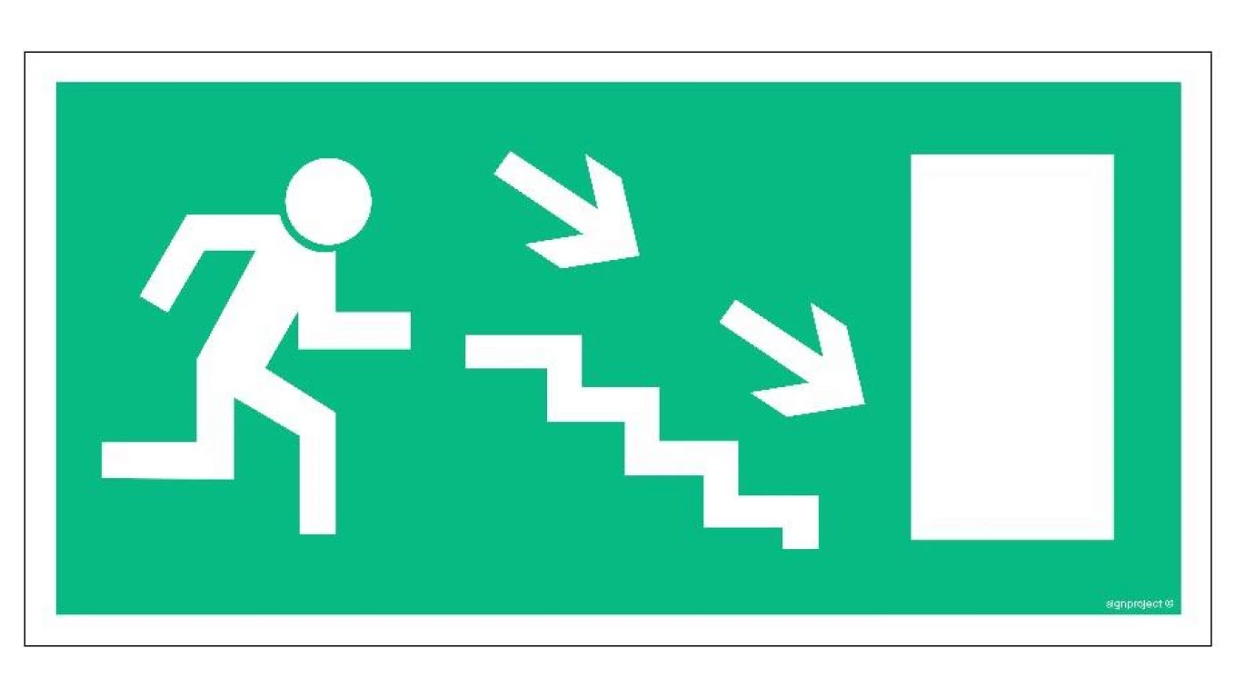 ZNAK - AC017 Wyjście ewakuacyjne w prawo schodami w dół 30 x 15 cm FS - Folia samoprzylepna foto.