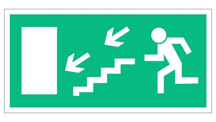 ZNAK - AC018 Wyjście ewakuacyjne w lewo schodami w dół 80 x 40 cm KS - Folia podłogowa foto.
