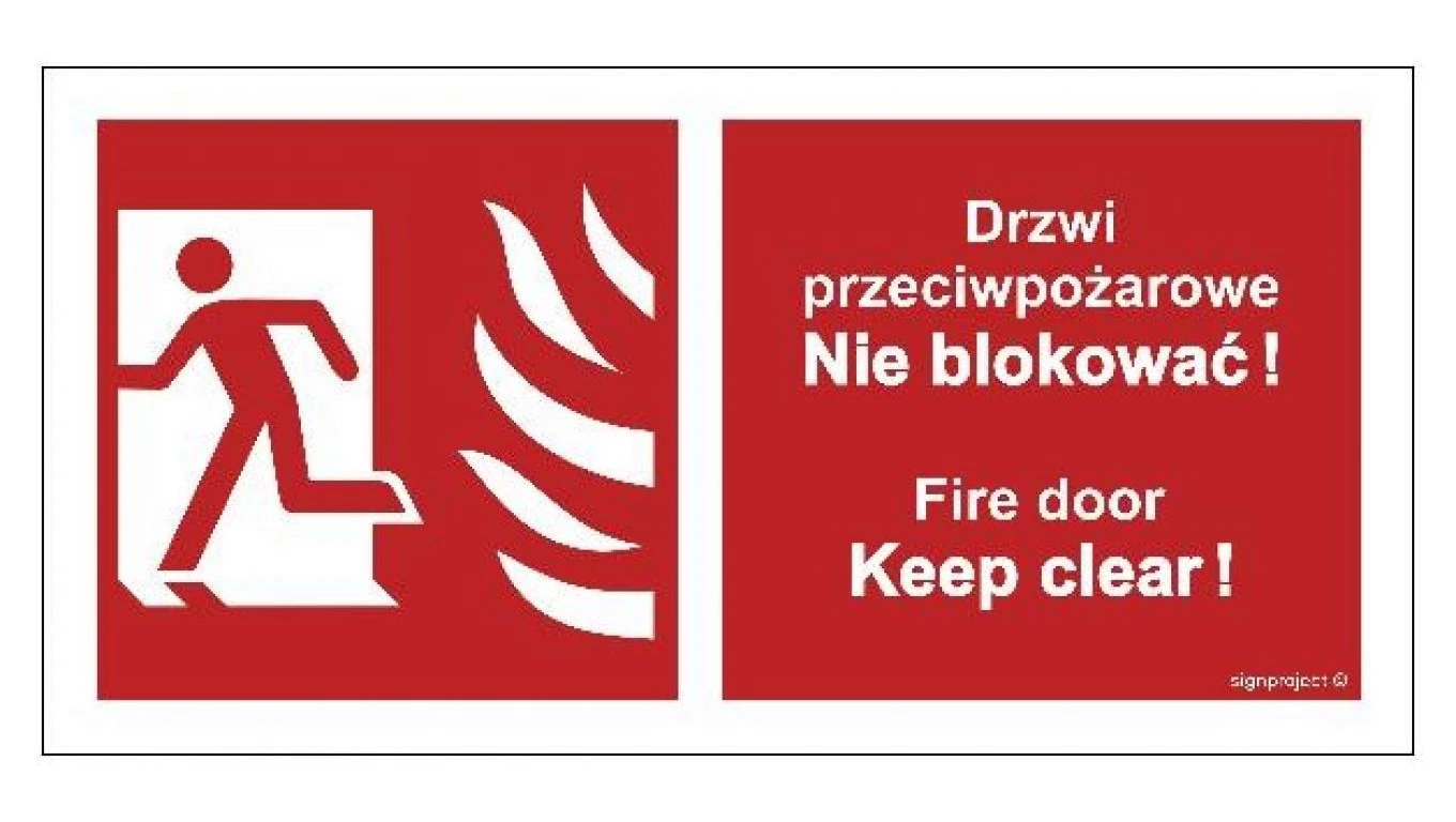 ZNAK - BC050 Drzwi przeciwpożarowe, Nie blokować ! Fire door, Keep clear ! lewostronne 30 x 15 cm PS - Płyta 1mm foto.