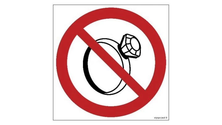 ZNAK - GB034 Zakaz noszenia biżuterii - arkusz 12 naklejek 5 x 5 cm FN - Folia samoprzylepna