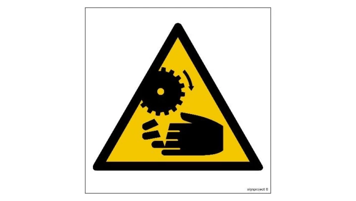 ZNAK - GE021 Ostrzeżenie przed możliwością obcięcia palców przez wirujące elementy 25 x 25 cm FN - Folia samoprzylepna