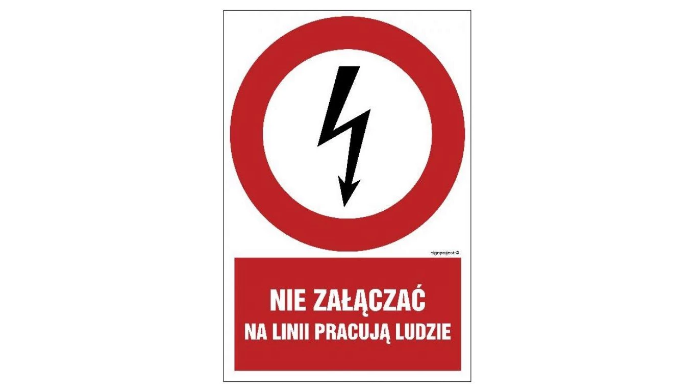ZNAK - HC011 Nie załączać na linii pracują ludzie 25 x 37,5 cm FN - Folia samoprzylepna