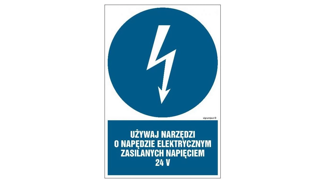 ZNAK - HE016 Używaj narzędzi o napędzie elektrycznym zasilanym napięciem 24V 20 x 30 cm PN - Płyta 1mm