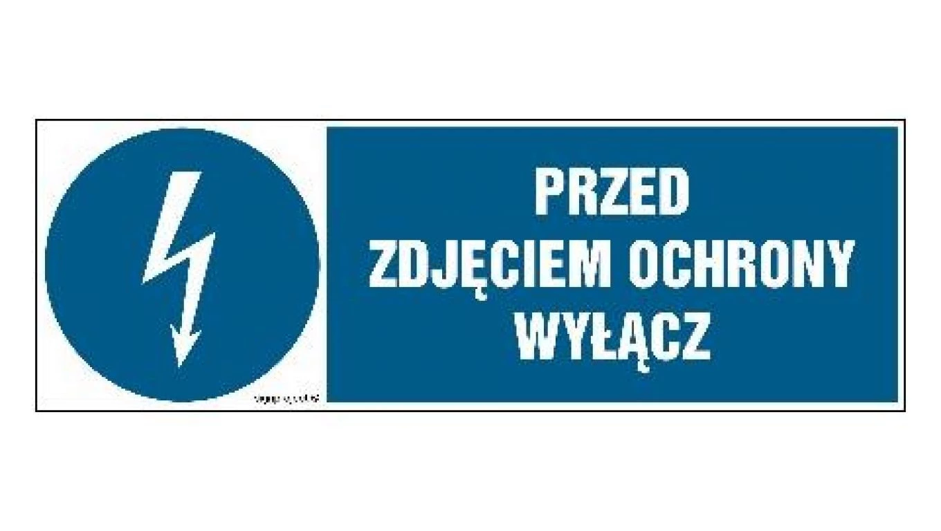 ZNAK - HF014 Przed zdjęciem ochrony wyłącz 15 x 5 cm FN - Folia samoprzylepna