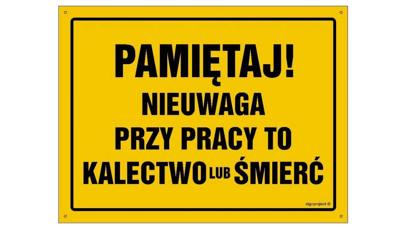 ZNAK - OA031 Pamiętaj! Nieuwaga przy pracy to kalectwo lub śmierć 80 x 57 cm FN - Folia samoprzylepna