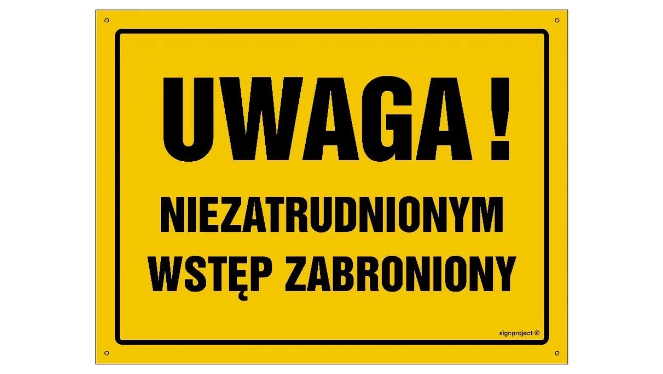 ZNAK - OA034 Uwaga! Niezatrudnionym wstęp zabroniony 30 x 21,5 cm FN - Folia samoprzylepna