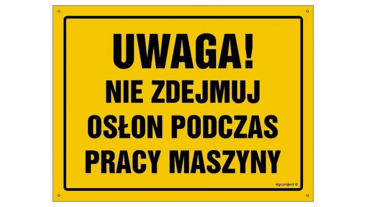 ZNAK - OA046 Uwaga! Nie zdejmuj osłon podczas pracy maszyny 30 x 21,5 cm FN - Folia samoprzylepna