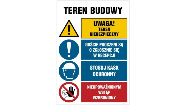ZNAK - OI011 Teren budowy, Uwaga! teren niebezpieczny, Goście proszeni są o zgłoszenie sie w recepcji, Stosuj kas 70 x 105 cm PN