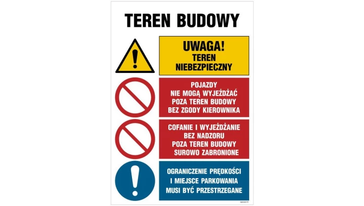 ZNAK - OI013 Teren budowy, Stosuj kamizelkę odblaskową, Stosuj obuwie ochronne, Sosuj kask ochronny, Uwaga! Samoc 70 x 105 cm ON
