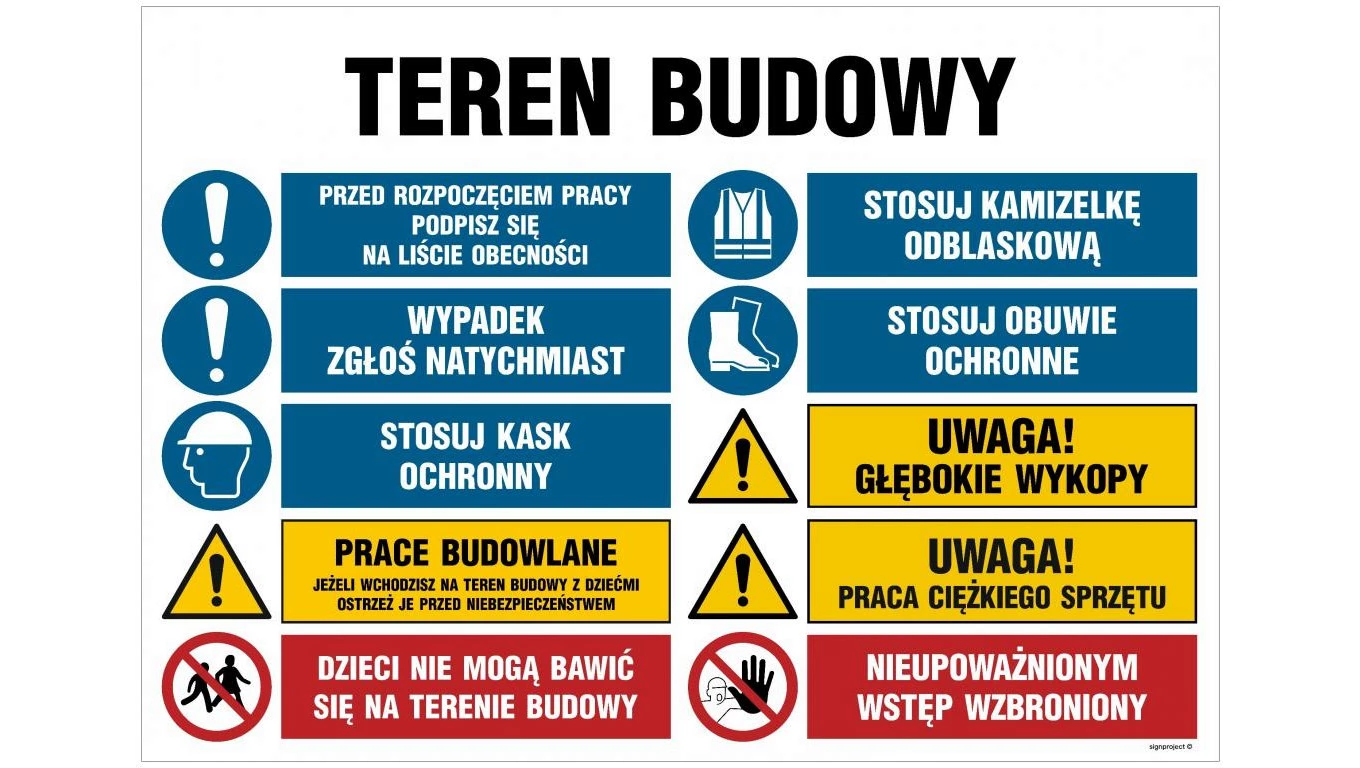 ZNAK - OI016 Teren budowy, Przed rozpoczęciem pracy podpisz się na liście obecności, Stosuj rękawice ochronne, St 100 x 75 cm PN
