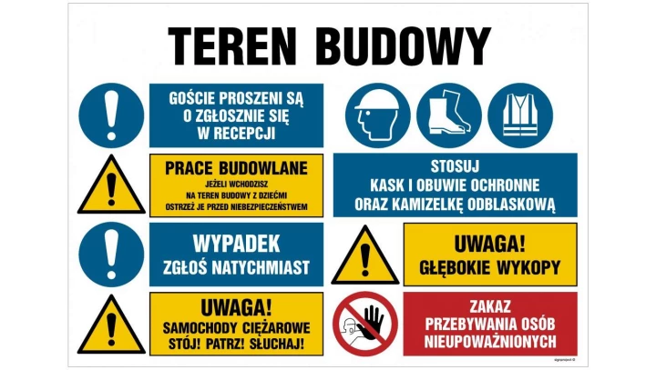 ZNAK - OI023 Teren budowy, Stosuj kask ochronny, Zakaz przebywania osób nieupoważnionych, Stosuj obuwie ochronne, 100 x 75 cm PN