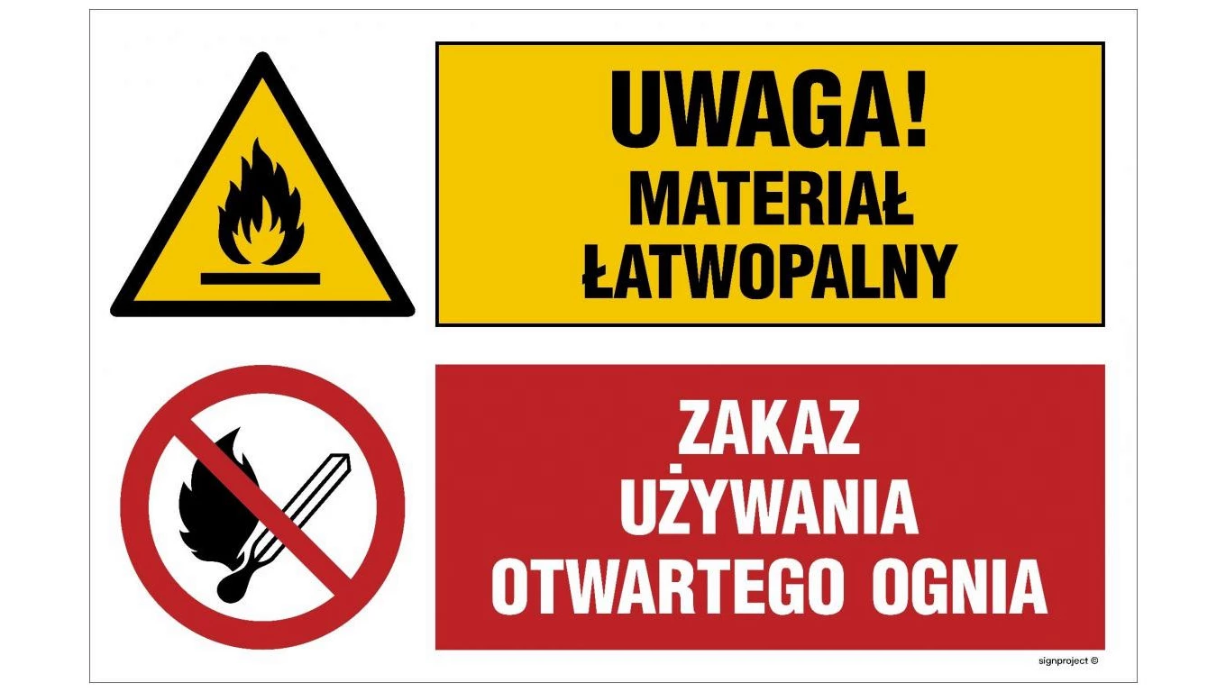 ZNAK - OI037 Uwaga! materiał łatwopalny, Zakaz używania otwartego ognia 70 x 46,7 cm FN - Folia samoprzylepna