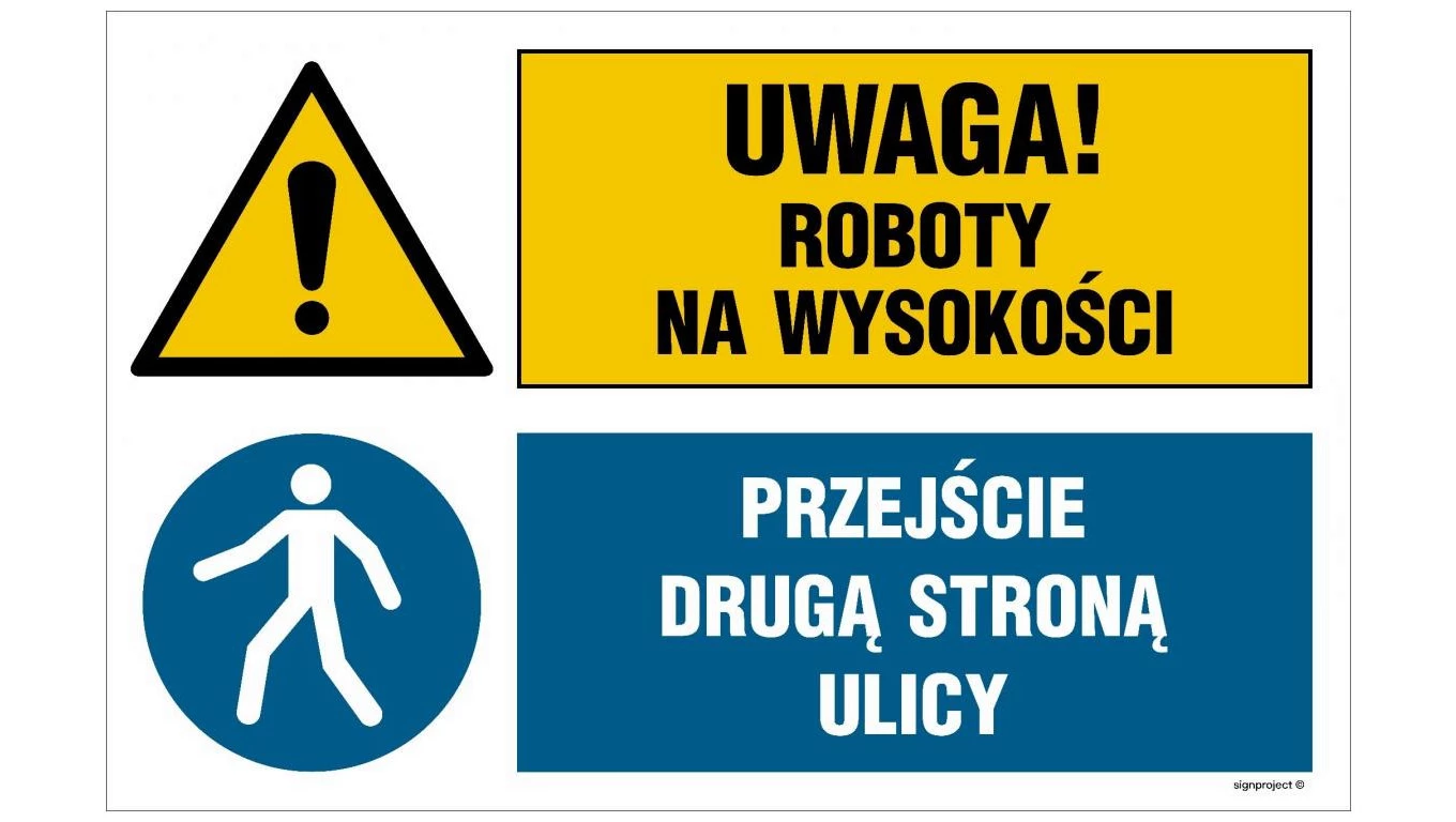 ZNAK - OI042 Uwaga! roboty na wysokości, Przejście drugą stroną ulicy 70 x 46,7 cm ON - Blacha ocynk